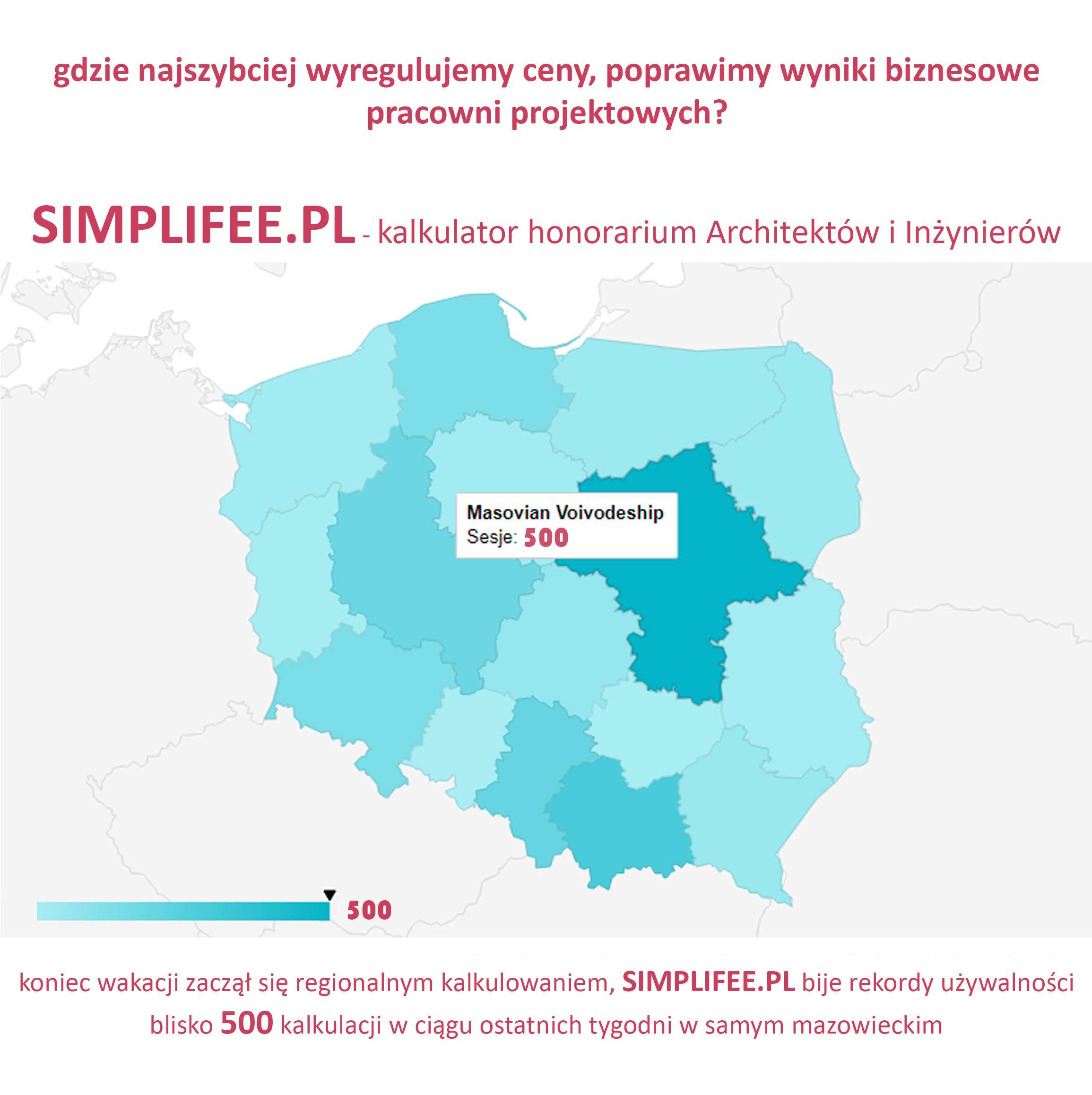 Używalność kalkulatorów w Polsce sukcesywnie wzrasta wraz z przyrostem użytkowników. Na koniec wakacji i początek roku szkolnego obserwujemy duży wzrost ilości kalkulacji. Bierze się to z pewnością ze zwiększonej aktywności rynku po okresie wakacji. Obserwując stosowalność wskaźników korekty wartości prac projektowych dochodzimy do wniosku, że większość z użytkowników kalkuluje swoje prace na poziomie minimalnym wynikającym ze standardów wykonywania zawodu co jest zachowaniem, które winno dobrze nastrajać środowisko. Na rynku gdzie wartość prac to jedyne kryterium oceny partnera projektowego, gdzie UZP preferuje rozwiązania najtańsze, często 60% do nawet 80% tańsze niż minima wynikające z regulaminów honorariów tendencja obserwowana w statystykach SIMPLIFEE pozwala domniemywać, że część projektantów podniosła ceny. i to jest bardzo dobry news ;)