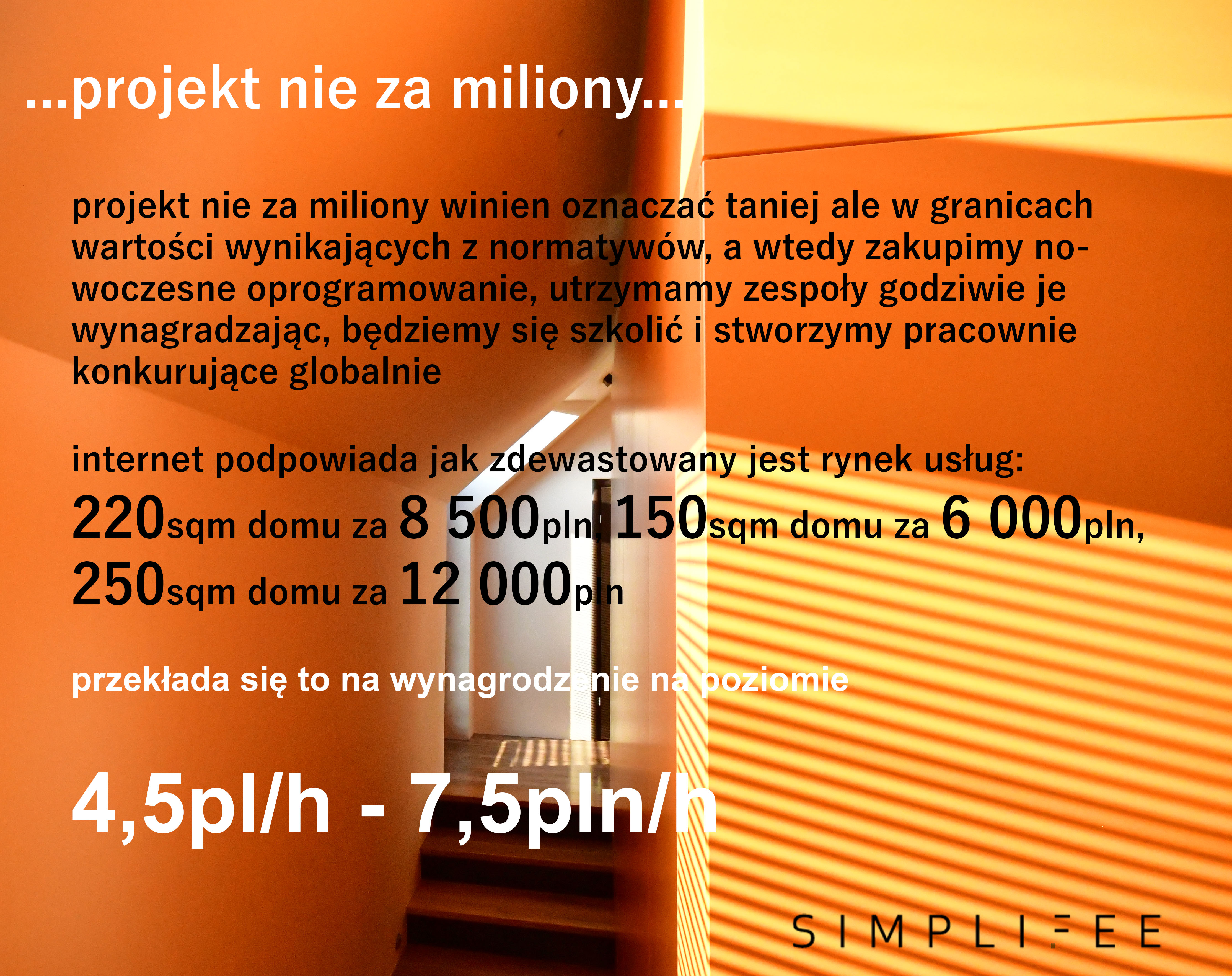 Zainspirował mnie powyższy tytuł, często można go zobaczyć na forach okupowanych przez architektów oraz potencjalnych klientów. Zastanawiałem się co to jest projekt ‘nie za miliony’? Pewnie tani, taki przyjazny dla kieszeni inwestora. Wyobrażenie o wartości prac projektowych jest zupełnie inne w przypadku pracowni projektowych wieloosobowych, jednoosobowych działalności gospodarczych oraz inwestorów. O ile Ci pierwsi to często świadome podmioty, fakt, że radzą sobie wciąż na rynku świadczy o skuteczności i sprawności menadżerów. Często rozumieją skalę przedsięwzięcia, nakłady jakie będą musieli ponieść, a także zdają sobie sprawę ze złożoności i specyfiki zadań, których się podejmują. W zdecydowanej większości wyceniają swoją pracę na poziomie minimów wynikających z regulaminów honorariów, co zapewnia im niewielkie marże, płynność finansową, zdolność do zatrudniania, rozwój i pracę na nowoczesnych narzędziach. Ci którzy ulegli pokusie zrobienia ‘taniej’, nie za miliony często borykają się z problemami związanymi z kondycją finansową firmy. O ile taki przypadek zdarza się okazjonalnie – wydarzenie takie staje się bolesną lekcją, która turbuje ale nie zabija, pozwala przetrwać podmiotowi, wyczula na rzetelne programowanie procesów dbanie o budżet i skuteczniejsze prowadzenie działalności w przyszłości. Jeśli praktyka staje się codziennością rokowania wobec takiej firmy są złe. Dla małych pracowni, jednoosobowych działalności gospodarczych zaniżanie cen to narzędzie pozwalające na konkurencję na rynku. Podobnie jak w przypadku firmy wieloosobowej, w dłuższej perspektywie czasowej prowadzi to do śmierci podmiotu. Z kolei inwestor zawsze musi mieć najtaniej. Tyle, że to architekci tworzą swój rynek wartości prac projektowych, i to od nas zależy jego kształt, od nas zależy co może oznaczać ‘taniej’. Stosowanie Regulaminów Honorarium, zasad wynikających z Rozporządzenia Ministra Infrastruktury nawet na poziomach minimalnych gwarantuje bezpieczeństwo pracowni – to powinien być cel środowiska, w realizacji tego zadania powinny nas wspierać Izby Okręgowe, KRIA a także wszelkie Stowarzyszenia i organizacje zrzeszające architektów różnej maści. ‘Taniej’ winno oznaczać poziom minimalny w kontekście przytoczonych normatywów, a nie połowa czy też mikroprocent tych wartości. Inwestor to zrozumie jeśli uwiarygodnimy mu proces i zakres nakładów z nim związanych. Dzisiaj robocizna murarza (roboczogodzina) jest lepiej wyceniana niż architekta, który obiekt zaprojektował, a kompetencje obu są polarnie różne. Dla przykładu podam iż obiekt o powierzchni 150sqm w zakresie robót murarskich można zrealizować za 50 000pln przez 2 miesiące (2-4 ludzi). Ten sam obiekt projektuje się (wraz z dokumentacją wykonawczą oraz pozyskaniem decyzji o pozwoleniu na budowę) w 4 miesiące, a uczestniczą w tym 4 branże (4-6 inżynierów) – wynagrodzenie wg RH winno sięgać 50 000pln, jednak rynek oferuje taką usługę często za kwoty mniejsze niż 20 000pln.