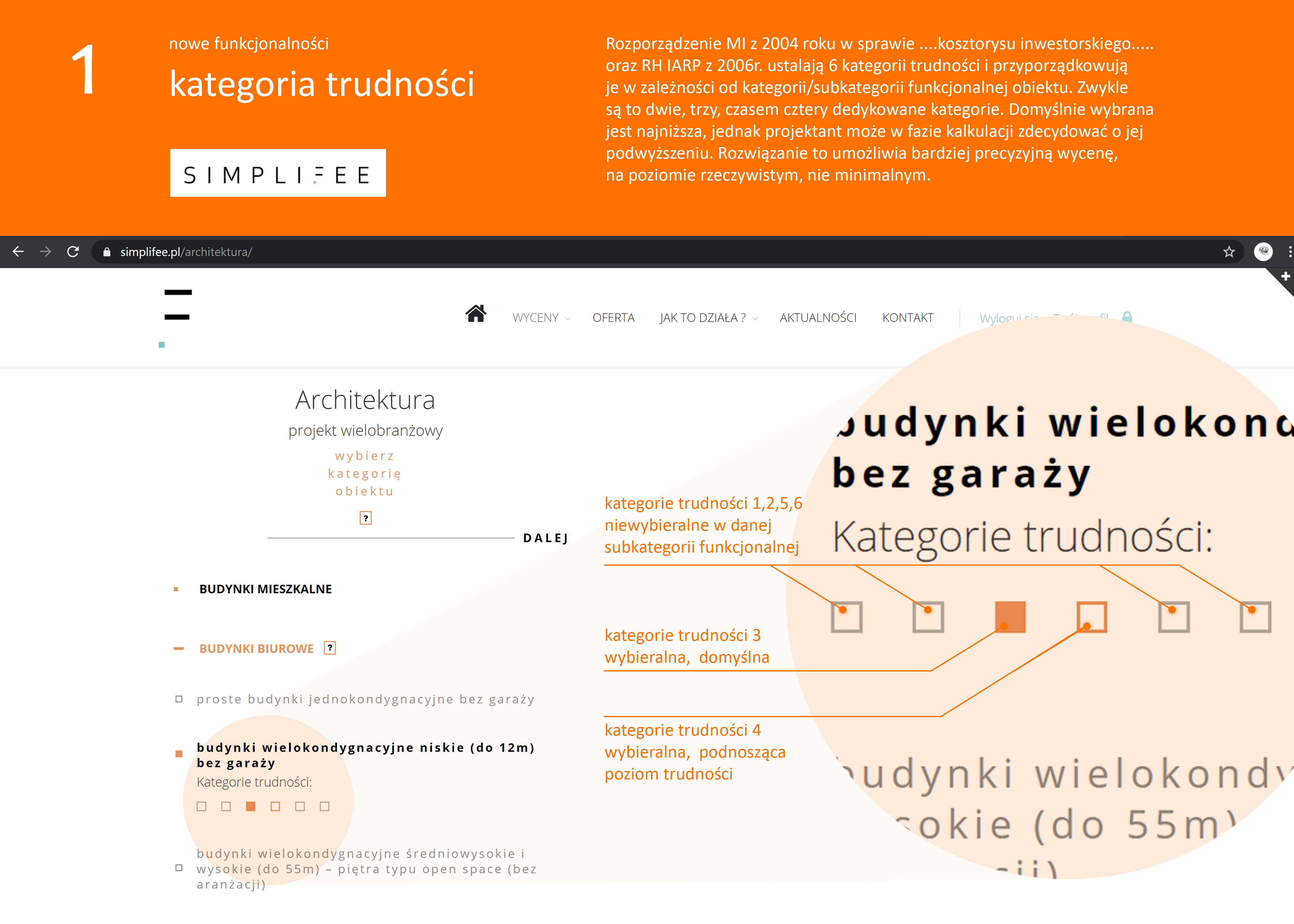 simplifee.pl w swojej pierwotnej wersji uwzględniało jedynie minimalny poziom trudności dla poszczególnych subkategorii funkcjonalnych. Chcieliśmy zwrócić uwagę użytkownikom jak bardzo różnią się ich wyceny, wyceny spotykane na rynku chociażby w przestrzeni przetargowej od wycen minimalmych. Tylko nieliczna grupa użytkowników realizowała możliwość podnoszenia wartości w zależności od poziomu trudności, za pomocą 'wskaźnika korekty', który działa w narzędziu od samego początku. Dzisiaj wprowadzamy narzędzie o stosowaniu którego zadecyduje sam projektant i zrobi to w zgodzie ze standardami wykonywania zawodu. Celem jest indywidualizacja i precyzja w wycenianiu prac projektowych ale także ujednolicenie rynku, próba unifikacji która ma posłużyć poprawie kondycji firm projektowych oraz projektantom przez nie zatrudnianym. Zmierzamy do realizacji narzędzia bardzo precyzyjnego i łatwego w użytkowaniu stąd kolejne upgrady ułatwiające prace kosztorysowe, uwiarygadniające ale także indywidualizujące proces - dostosowując go do specyfiki użytkownika. Sam proces dzisiaj jest bardzo prosty i intuicyjny, nie wymaga wiedzy o rynku inwestycyjnym czy rynku nieruchomości. Wymaga jedynie zaangażowania przez kilka minut, a efektem jest wycena zgodna z normatywami.