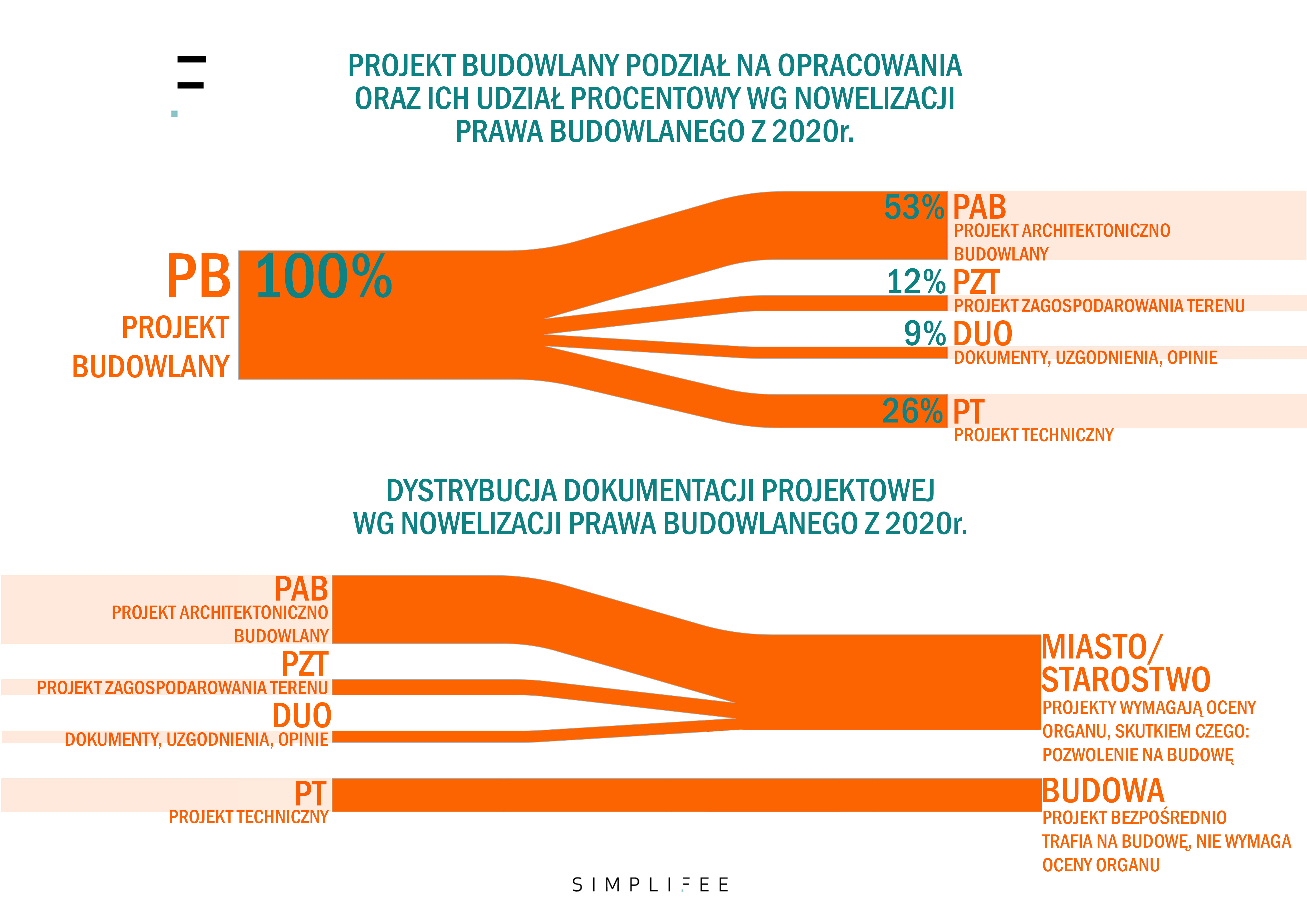 Wielu architektów i inżynierów myli Projekt Wykonawczy z elementem Projektu Budowlanego jakim jest Projekt Techniczny. Intencją ustawodawcy było uproszczenie procedury pozyskiwania Decyzji o Pozwoleniu Na Budowę - dlatego dokonał nowego podziału Projektu Budowlanego na cztery części: Projekt Architektoniczno Budowlany, Projekt Zagospodarowania Terenu, oraz opracowanie zawierające Opinie, Uzgodnienia, Inne Dokumenty, a także Projekt Techniczny. Z wymienionych czterech faz pierwsze trzy podlegają ocenie przez organy administracji państwowej, czwarta trafia bezpośrednio na budowę i takiej oceny nie wymaga. Natomiast Projekt Wykonawczy niezmiennie pozostaje jedną z Usług Podstawowych świadczonych przez Architekta. Wychodząc z tego założenia wartość Projektu Budowlanego pozostaje niezmieniona, a jednynie wewnętrzna partycypacja opracowań ulega zmianie. Założyliśmy, że mimo nie ujawniania w dokumentacji trafiającej do oceny przez organy administracji państwowej projektów branżowych, które składają się na Projekt Techniczny, projekty takie mają swój udział we wszystkich trzech fazach Projektu Budowlanego, które podlegają ocenie. Z doświadczenia wynika, że branża konstrukcyjna jest nierozłączna z fazą PAB, założenia statyczne trzeba uwzglednić na tym etapie co wymaga analiz mechanicznych. Branże sanitarna i elektryczna również partycypują w etapach podlegających ocenie przez organy administracyjne choć w mniejszym zakresie niż branża konstrukcyjna.To ma wpływ na procentowy udział PAB w PB i powoduje paradoksalnie, że PT ma mniejszą wartość niż PAB. W przyszłości będziemy badać rozkład udziałów branżowych by precyzyjnie wyceniać fazy Projektu Budowlanego. Diagram empiryczny, który stworzyliśmy ma przyczynić się do dyskusji na temat udziału poszczególnych faz w projekcie Budowlanym