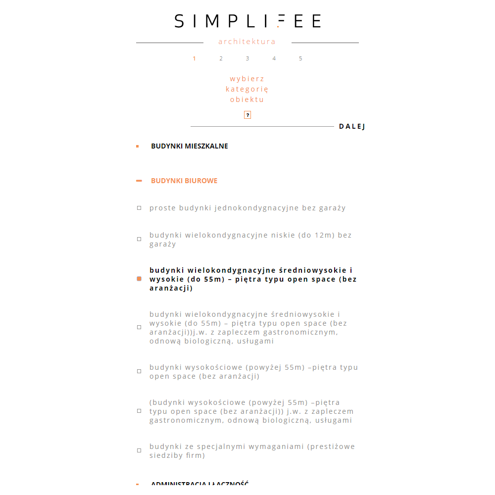 W 2016 r. kalkulator Simplifee - funkcjonujący w oparciu o regulamin honorariów architekta z 2006 r. - stał się narzędziem dostępnym online. Niesamowicie ułatwia on proces wyceny, przez co mogą Państwo zapomnieć o żmudnym wertowaniu regulaminów, pochłaniającym mnóstwo czasu. Zaoszczędzony czas można przeznaczyć na poszukiwanie nowych zleceń lub realizację pozyskanych już projektów. Obsługa programu jest naprawdę prosta - po dokonaniu kilku wyborów oraz podania powierzchni całkowitej obiektu otrzymujemy wartość danego zadania na poziomie minimalnym. Sporo architektów korzysta z kalkulatora Simplifee w obecności inwestora, co dodatkowo uwiarygodnia proces kalkulacji. Kalkulator Simplifee to narzędzie doskonałe również dla osób związanych z inwestycjami, gdyż umożliwia im określenie szacunkowych cen inwestycji.