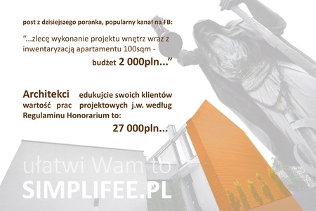Dzisiaj na jednym z kanałów facebook'owych pojawiło się ogłoszenie pewnego, pewnego siebie, jegomościa, który poszukiwał architekta do zaprojektowania i zinwentaryzowania apartamentu w Gdańsku. Podał nawet budżet jaki posiada na realizację powyższego zadania. I w tym miejscu zaczyna się problem - budżet to 2000 pln. Wg RH koszt projektowania wnętrz apartamentu …
