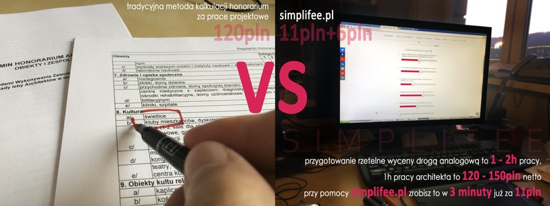 Dziś wystartowaliśmy z pierwszym (z całej serii) kalkulatorem honorariów architekta. Jesteś architektem, architektem wnętrz, inżynierem lub inwestorem czy osobą prywatną zainteresowaną wyceną usług z zakresu architektury? Zastanawiasz się, jak powinien być wyceniony prawidłowo projekt architektoniczny czy budowlany? Może chciałbyś wiedzieć, ile średnio kosztuje planowana przez Ciebie inwestycja? Dobrze trafiłeś! Simplifee …